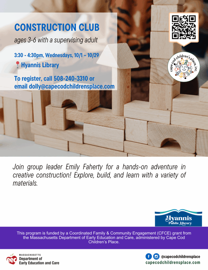 To register: Call Cape Cod Children’s Place, 508-240-3310